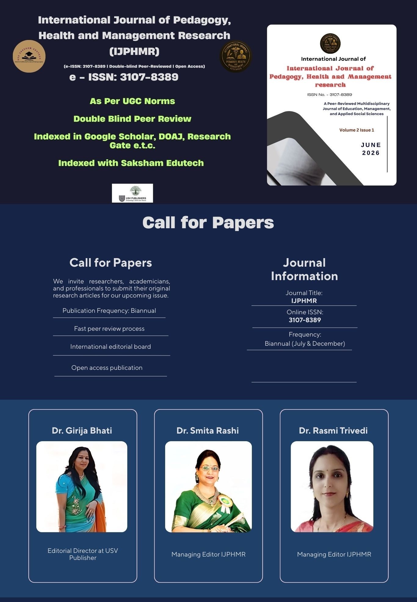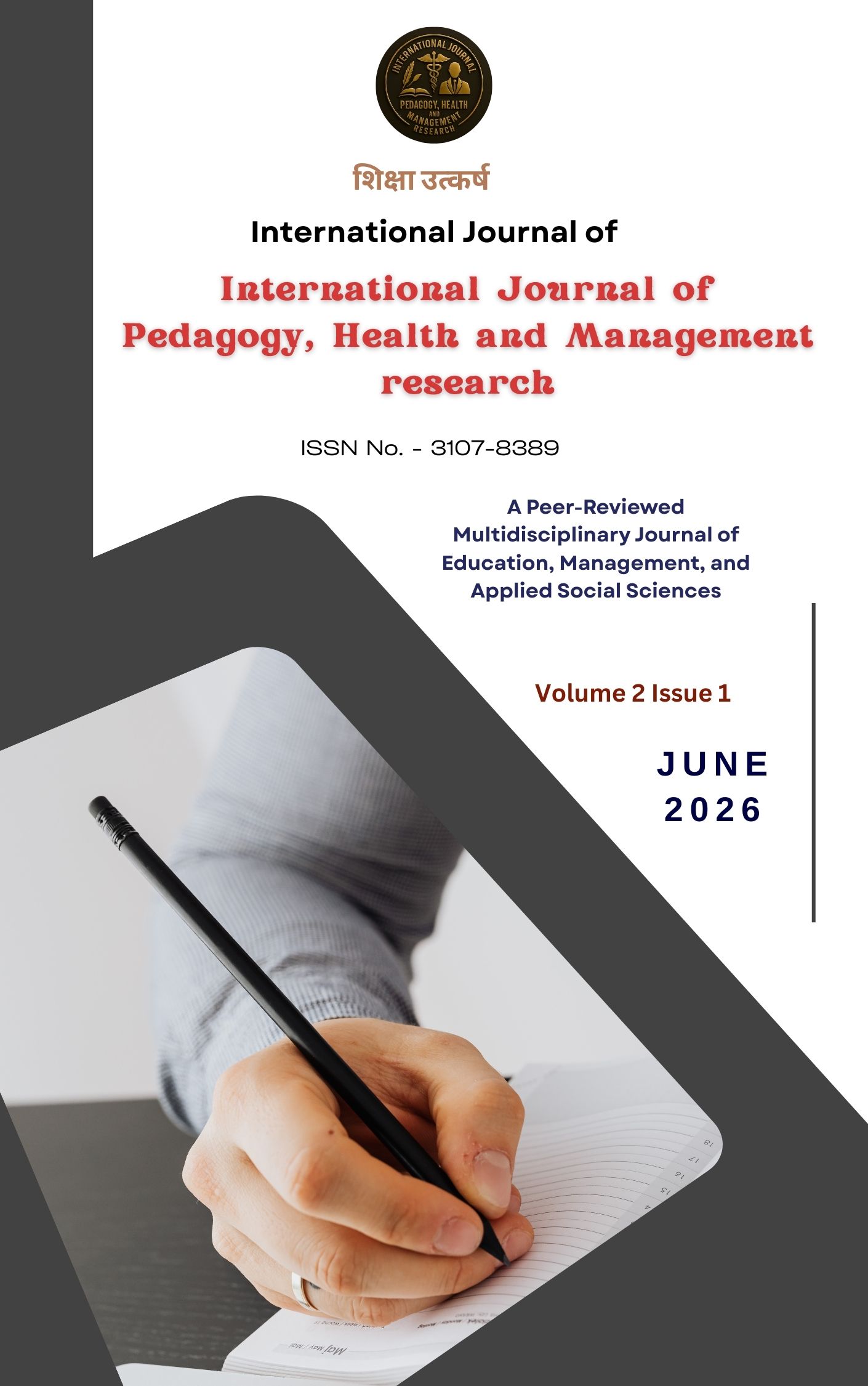 International Journal of Pedagogy, Health and Management Research (IJPHMR) (Online ISSN: 3107-8389) is a peer-reviewed, open access multidisciplinary journal dedicated to advancing high-quality research in education, health sciences, management, and allied social sciences. The journal promotes innovative pedagogical practices, policy analysis, sustainable development research, and interdisciplinary scholarship. IJPHMR follows a transparent double-blind peer review process, adheres to ethical publishing standards, and publishes under the Creative Commons CC BY 4.0 license to ensure global accessibility. Indexed in academic search platforms, the journal aims to foster impactful research and scholarly excellence at national and international levels.
